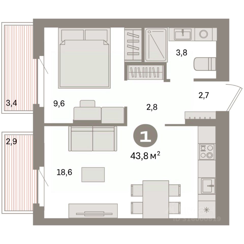 Квартира с кухней-гостиной и одной спальней в квартале ''Депо''. Особенности планировки: балкон, предчистовая отделка. квартиры в нашей базе: ДЕП04-Ж8.4.5.