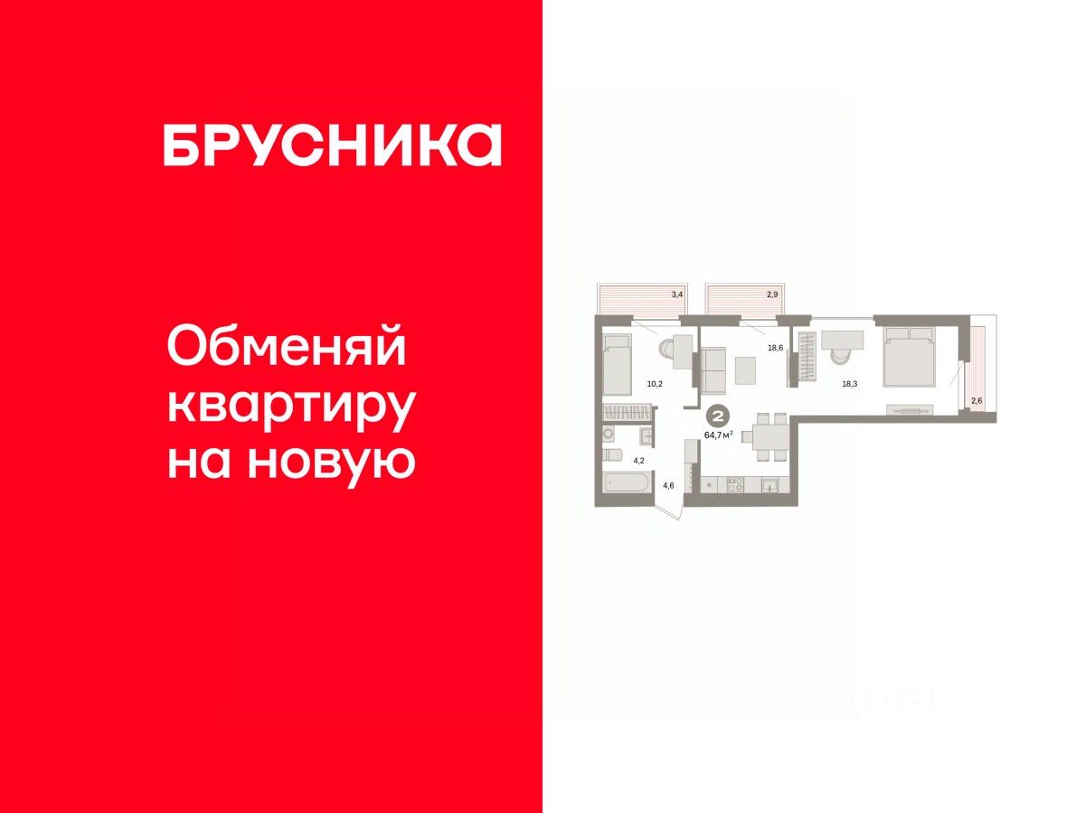 Квартира с кухней-гостиной и двумя спальнями в квартале ''Депо''. Особенности планировки: балкон, предчистовая отделка, разнесённые спальни. квартиры в нашей базе: ДЕП07-Ж3.5.3.