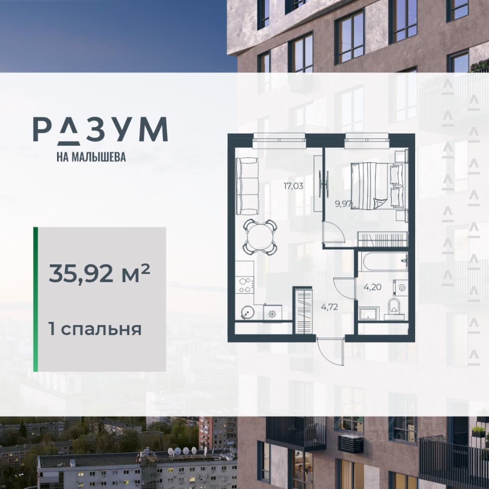 ''РАЗУМ на Малышева'' — это четыре 31-этажных башен на улице Малышева. Дополнительная приватность, безопасность и тишина создаётся за счёт возвышения домов на стилобате. Балконы на фасадах открывают виды на город и во двор, а угловые террасы открывают ещё больше простора и потрясающих видов. Жители квартала ''РАЗУМ на Малышева'' наслаждаются зелёными зонами круглый год. 60% территории занимает озеленение с деревьями, кустарниками и многолетниками. Здесь прогулки, отдых, работа и встречи с друзьями проходят в уютных зонах с перголами, шезлонгами и гамаками. ''РАЗУМ на Малышева'' — это: