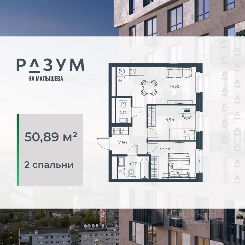 ''РАЗУМ на Малышева'' — это четыре 31-этажных башен на улице Малышева. Дополнительная приватность, безопасность и тишина создаётся за счёт возвышения домов на стилобате. Балконы на фасадах открывают виды на город и во двор, а угловые террасы открывают ещё больше простора и потрясающих видов. Жители квартала ''РАЗУМ на Малышева'' наслаждаются зелёными зонами круглый год. 60% территории занимает озеленение с деревьями, кустарниками и многолетниками.
