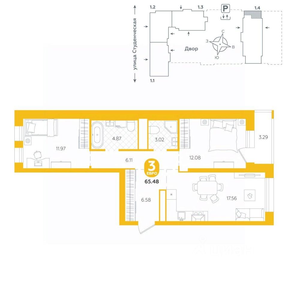 Квартира в семейном жилом комплексе комфорт-класса ''Тёплые кварталы'' на границе Пионерского микрорайона и Втузгородка в Екатеринбурге. В данном районе сосредоточено большое количество знаменитых вузов, поликлиники, культурно-спортивные центры. Детский сад находится во дворе второго дома жилого комплекса. Дома переменной этажности в едином стиле образуют современный эстетичный квартал, на территории которого будет безопасно и интересно. Двор закрыт от машин и посторонних - доступ только для жителей по электронному ключу, видеонаблюдение 24/7. Дизайн двора выполнен в экостиле - из натуральных материалов. Качели, горки и скамейки выполнены в природных оттенках. Во дворе дети смогут придумывать всевозможные сценарии игр. Для родителей есть тихая лаундж-зона и места для занятий спортом. Озеленение сделает двор всесезонным - будут высажены пихты, яблони, можжевельник и гортензии. Для домов ЖК ''Тёплые кварталы'' предусмотрена отдельная котельная. Это позволит экономить на коммунальных платежах и пользоваться горячей водой без перебоев круглый год. Кирпичный дом отличается высокой энергоэффективностью и долговечностью, а также широкими подоконниками, которые не встретить в монолитных домах. Предусмотрен подземный паркинг и кладовые. Срок сдачи 3 квартал 2026 г. этаж - 23 количество комнат - 3 номер помещения - 543 площадь квартиры - 65,48 кв.м высота потолка - 2,75 м Квартира разработана с акцентом на удобство и практичность. Спальня создает атмосферу для спокойного отдыха, а ванная комната оснащена всеми необходимыми удобствами. Благодаря большим окнам все помещения хорошо освещены и идеально подходят для расстановки мебели. Планировка кухни позволяет эффективно зонировать пространство. Приобрести квартиру можно с предчистовой отделкой или с готовым ремонтом.