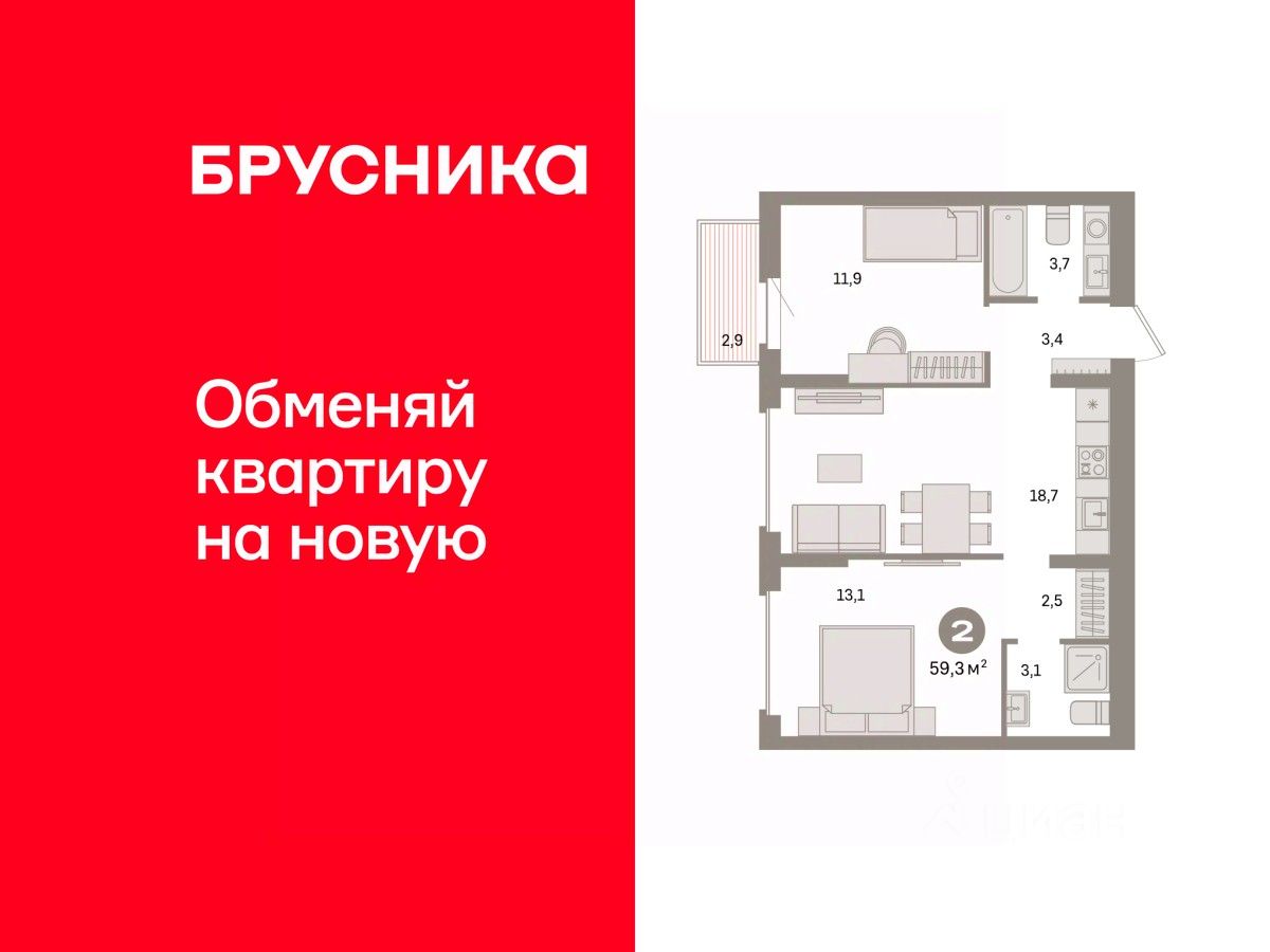 Квартира с кухней-гостиной и двумя спальнями в квартале ''Депо''. Особенности планировки: балкон, предчистовая отделка, разнесённые спальни. квартиры в нашей базе: ДЕП04-Ж1.7.5.