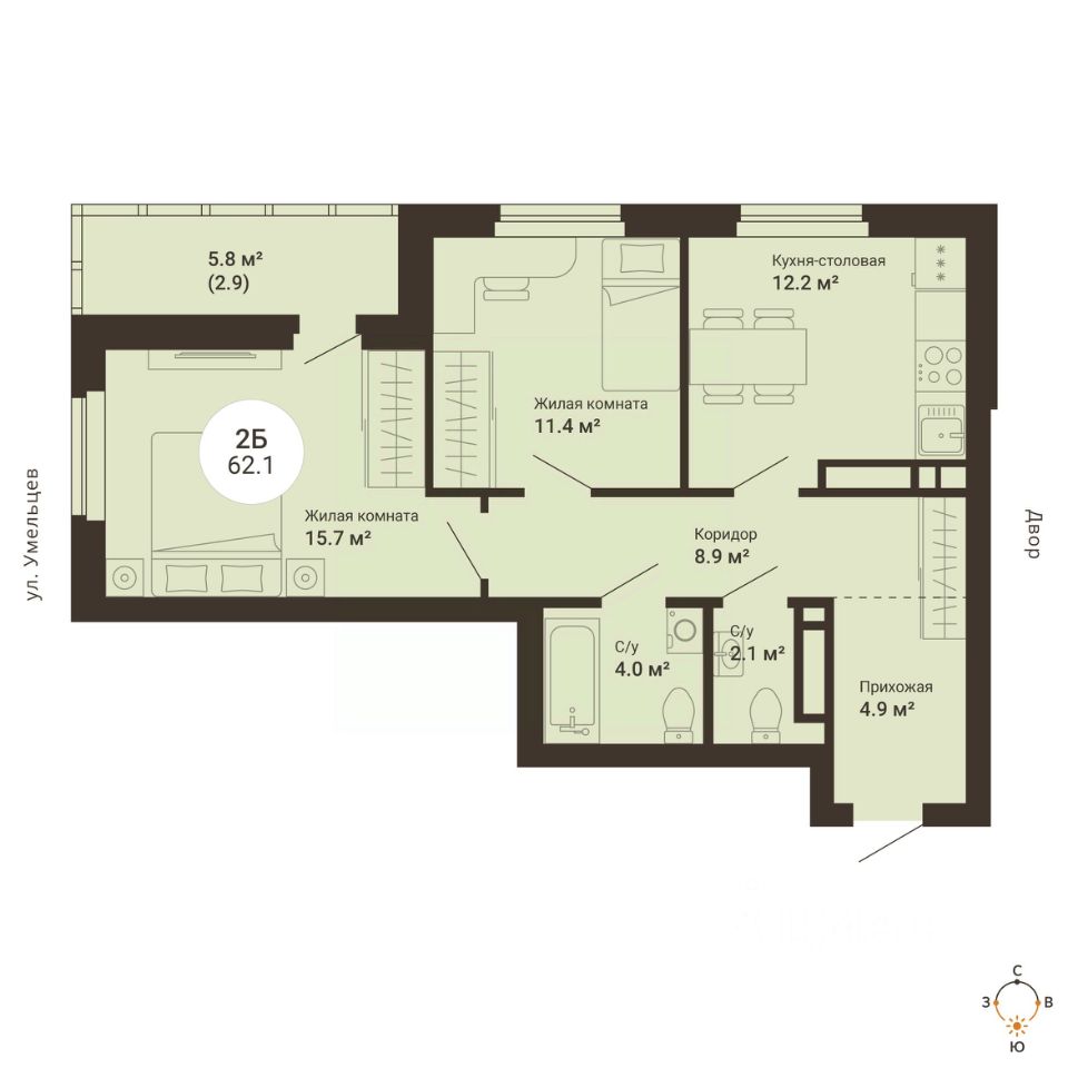 Общая площадь62,1 м2