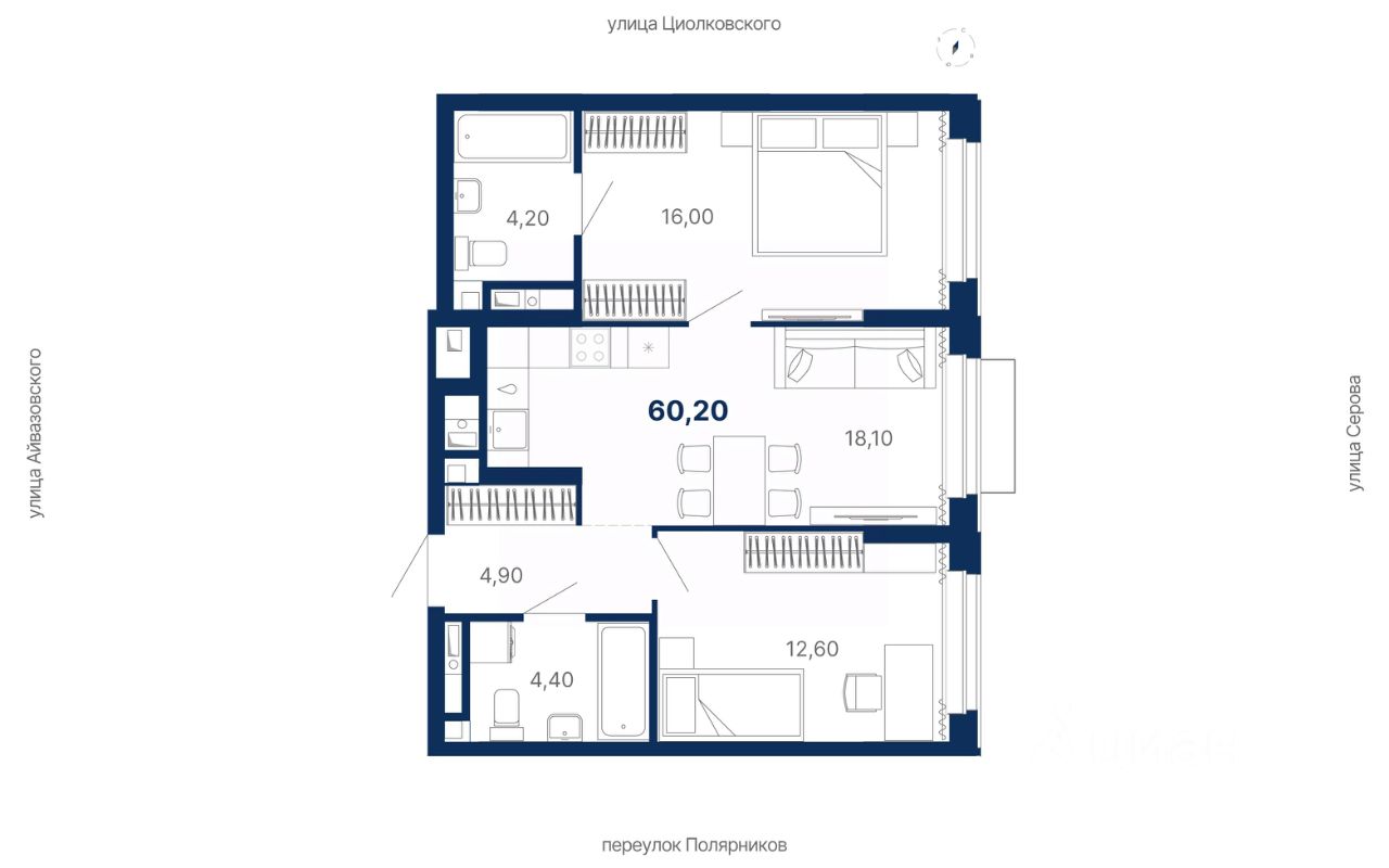 Комплекс представляет собой жилую экосистему Комфорт+ класса: многосекционный дом, закрытая территория, паркинг и коммерческая инфраструктура внутри комплекса.