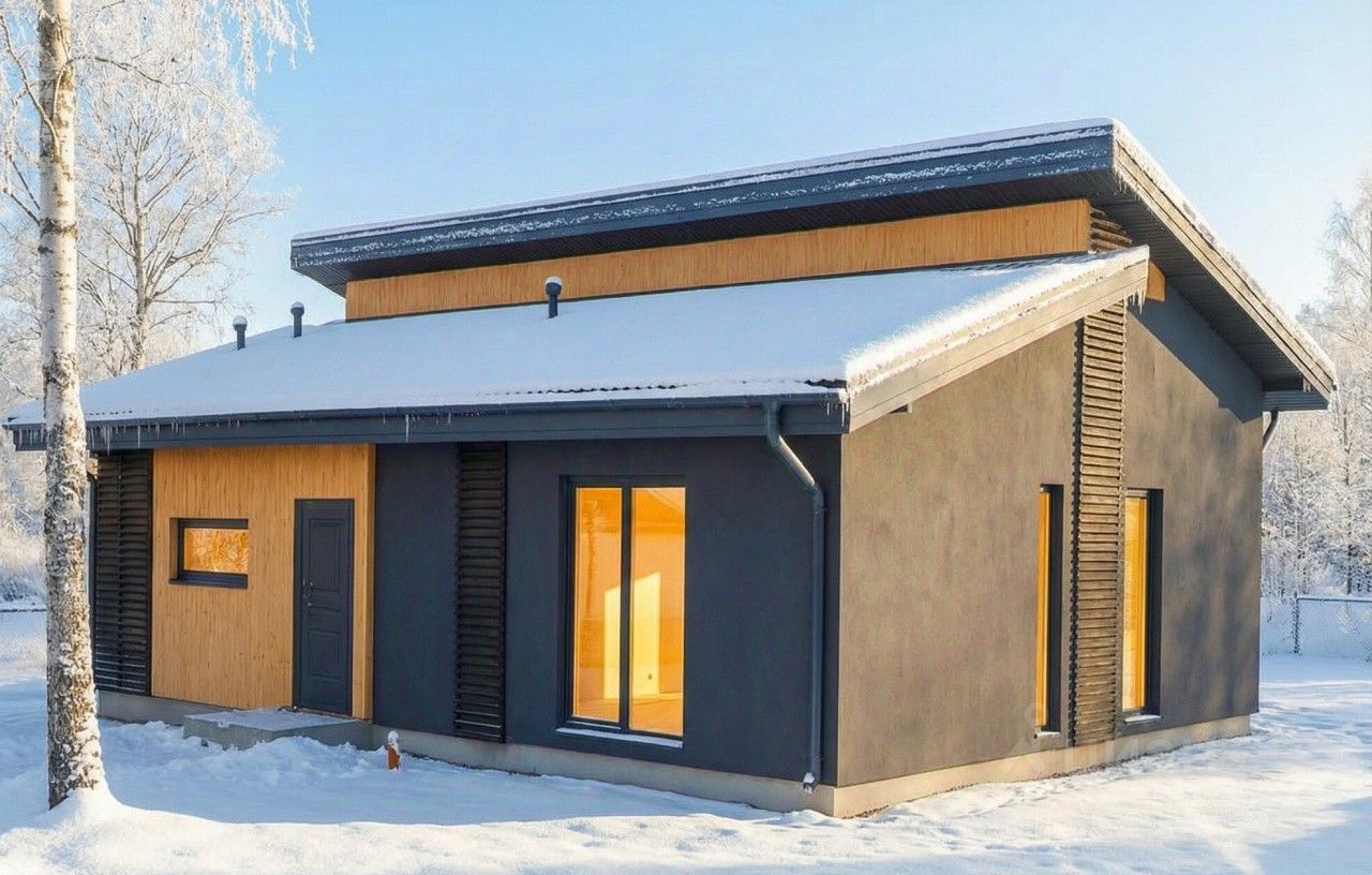 ДОМ ОДНОЭТАЖНЫЙ ПО ПРОЕКТУ ''Домбай'' Общая площадь: 88 м2 Площадь отапливаемых помещений: 86 м2 Количество этажей: 1 Количество комнат: Кухня-гостиная и 2 спальни Фундамент свайно-ростверковый Материал стен: газобетонный блок, с утеплением минеральной ватой 100мм. Крыша: двускатная, сделана с утеплением 200мм закрыта металлочерепицей. Обогрев дома по проекту: электрокотел. Водоснабжение: скважина 50 м Септик - выгребная яма (кольца). Отделка фасадов и цоколя: декоративная штукатурка c элементами планкена.