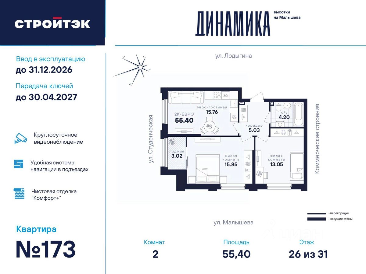 Настройте жизнь на максимум В Динамике воплощают мечты. Её фасады стремятся ввысь и рисуют силуэт ступеней — символа вашего движения, где всё задуманное сбывается. В интеллигентном микрорайоне Втузгородок всё под рукой. Пешком до остановки 5 минут, на машине до центра — 10. Соседство с торговыми комплексами и доступность ЕКАД входят в число преимуществ квартала наравне с близостью УРФУ, главных театров, филармонии, школ и детсадов. Рядом озеро Шарташ, которому около миллиона лет. Здесь катаются на сапах, лодках и катамаранах, а в Шарташском лесопарке вокруг озера — на велосипедах летом и лыжах зимой. Новое звучание района Выразительные башни Динамики притягивают взгляды издалека. Сплошные стеклянные витражи фасадов меняют восприятие проекта в зависимости от ракурса, времени года и суток. В квартирах с витражным остеклением алюминиевые оконные рамы и широкие подоконники визуально увеличивают пространство. Благодаря современным технологиям витражи обеспечивают дополнительную теплоизоляцию, помогая сохранять комфортный микроклимат в квартире и летом, и зимой. Отдых в вашем ритме Выбирайте досуг по душе для себя и семьи. Занимайтесь на тренажёрах и воркаут-комплексе, играйте в пинг-понг, футбол или баскетбол. Для детей — насыщенный плейхаб, который тренирует тактильность и равновесие в атмосфере безопасности и контролируемого риска. Размеренно прогуливайтесь меж декоративных холмов, под тенистыми навесами-перголами вблизи удобных скамеек. СТРОЙТЭК возводит Динамику в 3 этапа. Первый этап строительства Секция 1 — башня в 31 этаж. В ней 209 1- и 2-комнатных квартир и 21 уникальная планировка — как в классическом исполнении, так и с просторными кухнями-гостиными до 22 м квадратных. Мы сдадим дом в 4 квартале 2026 года и выдадим ключи не позднее 30 апреля 2027 года. В подъезде вас встретят просторные светлые холлы с уютным минималистичным дизайном бизнес-класса, комфортные помещения для колясок и самокатов, а также 3 надёжных лифта на 1 000 кг каждый. Живите легко — мы об этом уже позаботились. Автономная газовая котельная позволит не зависеть от центрального отопления, а закрытый паркинг на 82 места внутри стилобата с подъёмом до этажа избавит от лишней суеты. Технологии комфорта Обратите внимание на планировки с гардеробными и тёплыми лоджиями, где 5-камерный ПВХ-профиль заботливо защитит от непогоды. И особенно — специальный формат квартир с террасами на 2 этаже: здесь так приятно проводить время с гостями, загорать на шезлонгах или ужинать при свечах. В Динамике улучшенный стандарт отделки ''Комфорт+''. Помимо привычных сантехники и электрики, в него входят оконные стёкла Energy Light, которые помогают сохранять комфортную температуру, приточные клапаны вентиляции Air-Box и детские замки, особо прочный ламинат 33 класса и устойчивые к многократной покраске виниловые обои. Белые межкомнатные двери и плинтусы лаконично подчеркнут любую цветовую гамму, а надёжная сейф-дверь добавит спокойствия и беззаботных моментов.