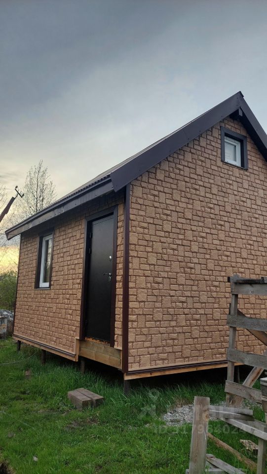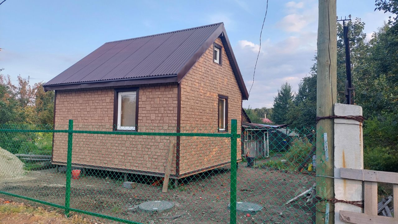 Продаётся садовый участок с недостроенным каркасным домом площадью 4x5,5 м и мансардным этажом. Здание находится на этапе нового строительства, и для его завершения есть дополнительные материалы.