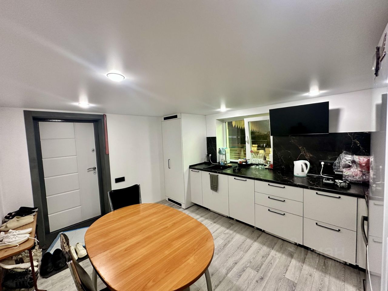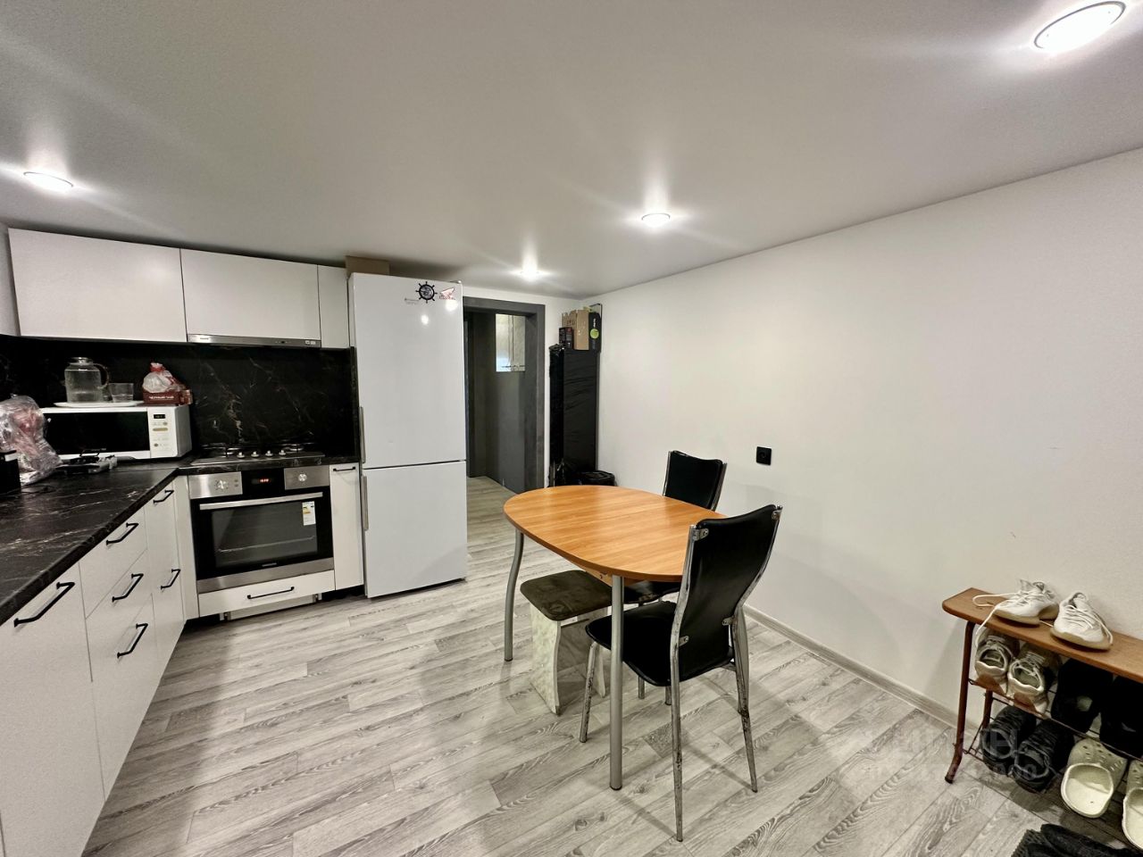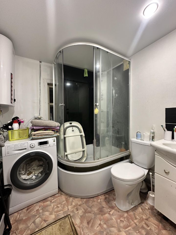 Остается новым хозяевам: - Водонагреватель - Душевая кабина - Унитаз - Тумба с раковиной - Кухонный гарнитур - Варочная панель - Встроенный шкаф