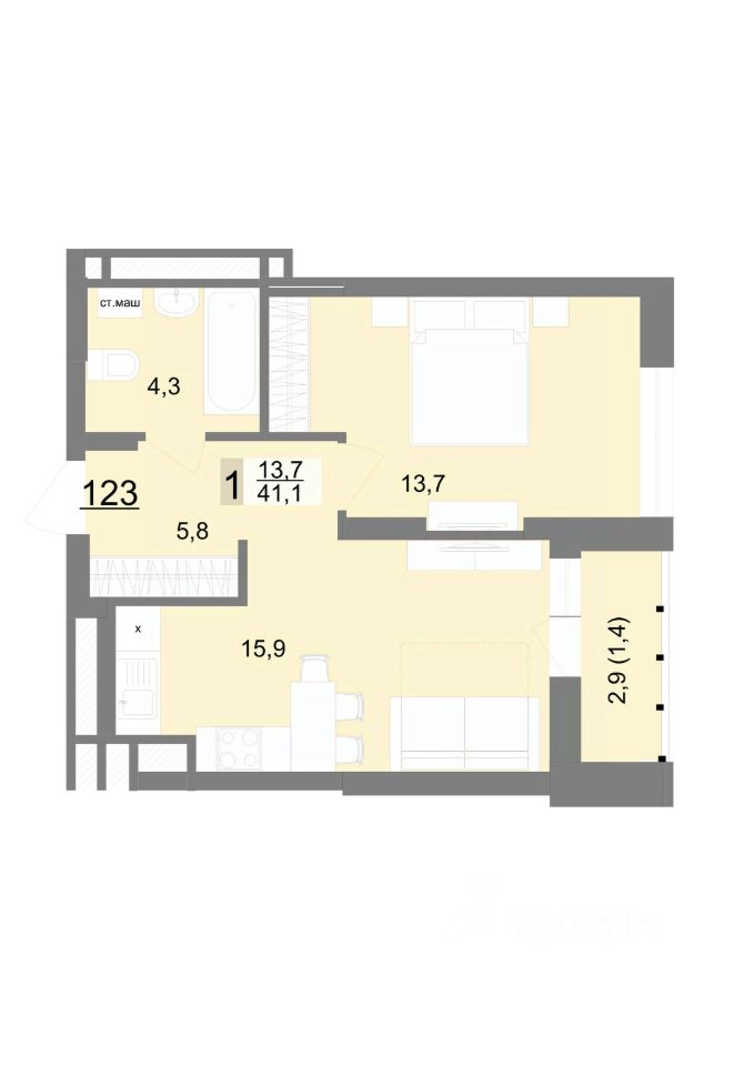 Общая площадь41,1 м2