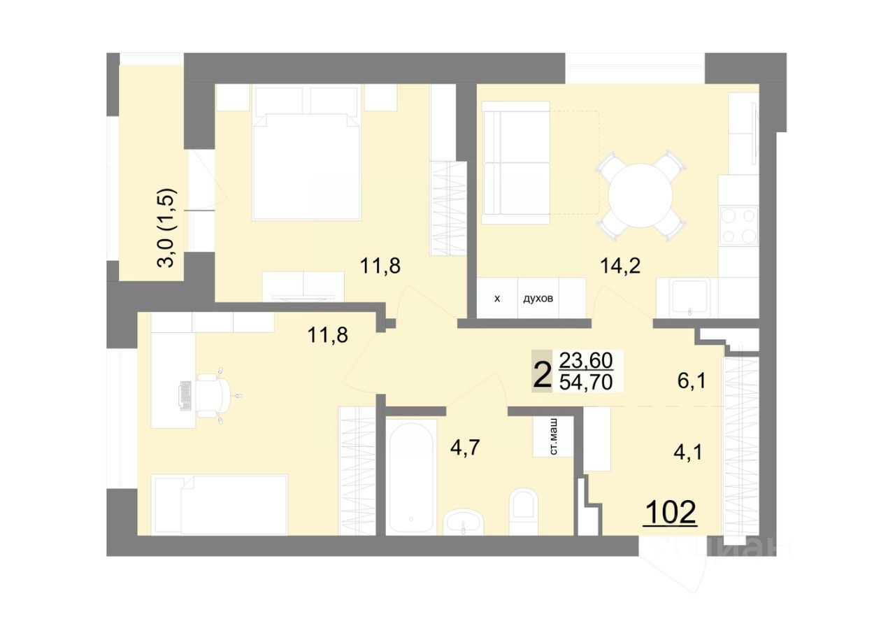 Общая площадь54,7 м2