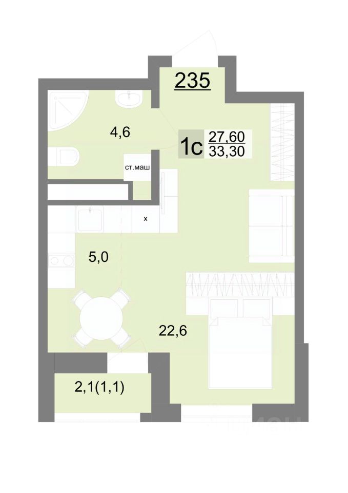 Общая площадь33,3 м2