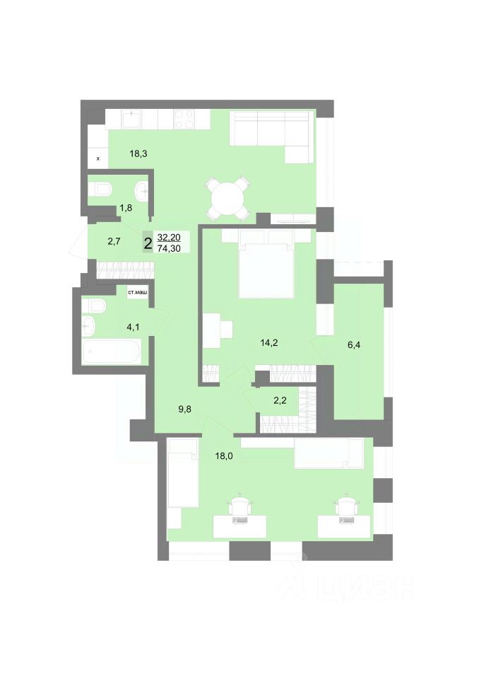 Общая площадь74,3 м2