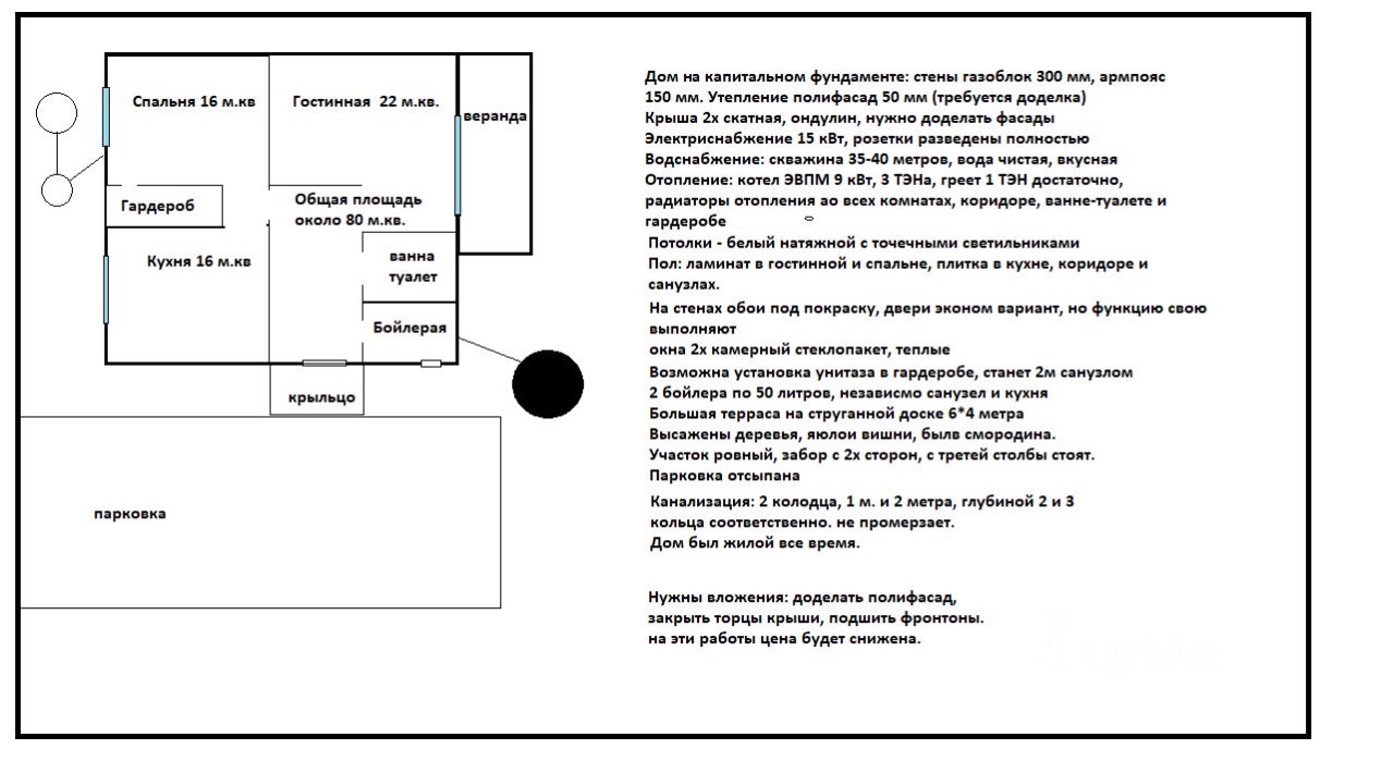 продам дом в поселке Александрия, дом для постоянного проживания, теплый. отапливается электро котлом на 9 кВт, стоит 2 бойлера по 50 литров. скважина на 35-40 метров, вода чистая. в доме сделан базовый ремонт, в комнатах на полу ламинат, в кухне, ванной и коридоре плитка. стены ванной и второго санузла в простой плитке. в доме сделана большая спальня-кабинет, гостиная и просторная кухня. потолок натяжной белый матовый, стоят точечные светильники. канализация 2 кольца по 2 метра в глубину. первый санузел полностью оборудован, ванна, раковина унитаз. второй санузел используется как кладовая-гардероб. на втором выходе сделана площадка 3*4 метра для отдыха. перед домом парковка отсыпанная щебнем. требуются некоторые работы по наружной отделке: подшить карнизы, и фасад крыши, а также закончить утепление стен под фасадом. в настоящее время дом сдается в аренду, и приносит некоторый доход. участок площадью 10 соток, с 2х сторон имеется забор, одна сторона стоят столбы. в отделке имеется богатая инфраструктура, детские площадки, два озера, магазин. дороги круглогодичный доступны, и освещаются в вечернее время. продажа в связи с переездом в другой город.