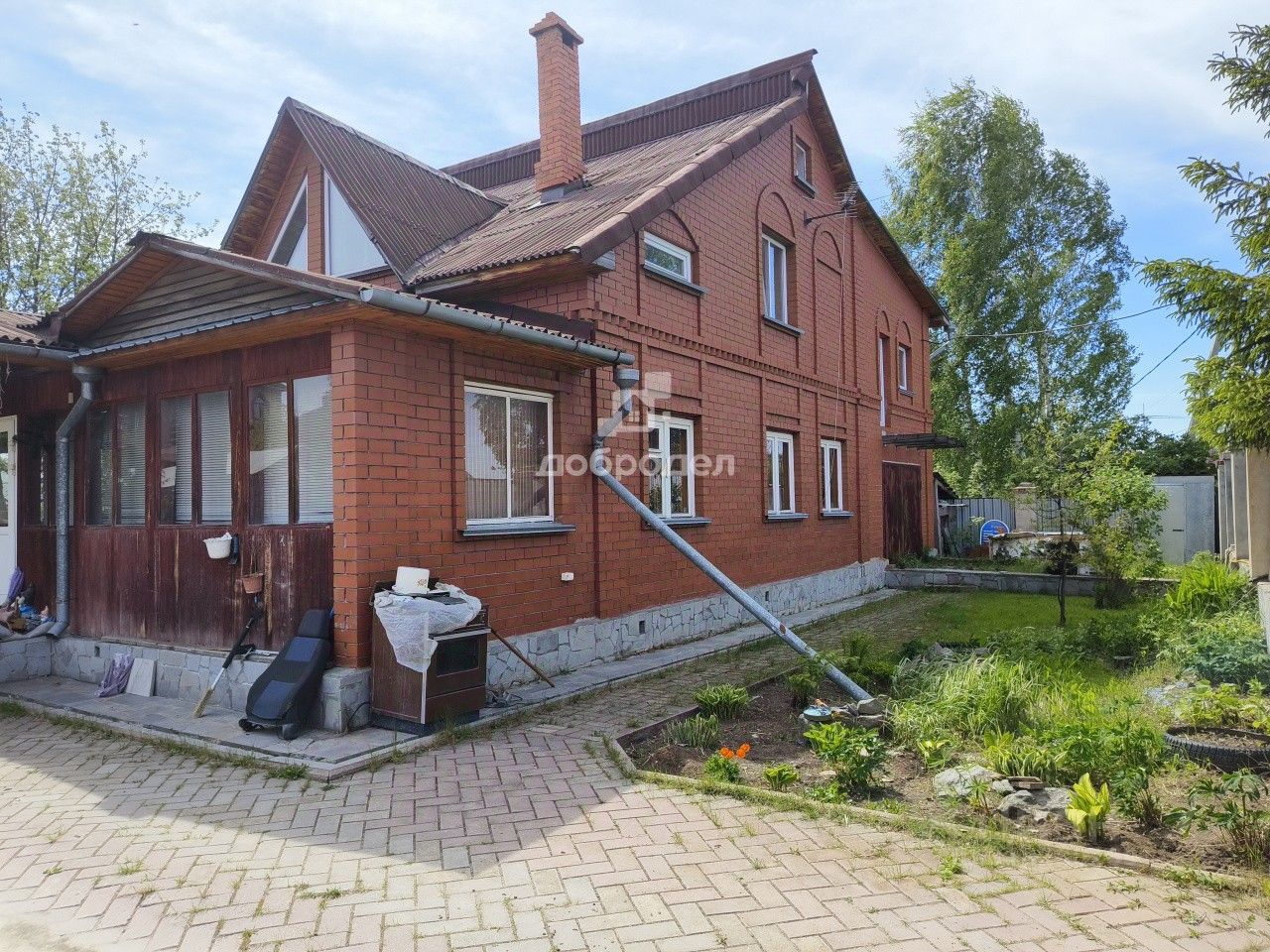 стены пристроя - газоблок, два этажа дома бревно, фасад- кирпич.