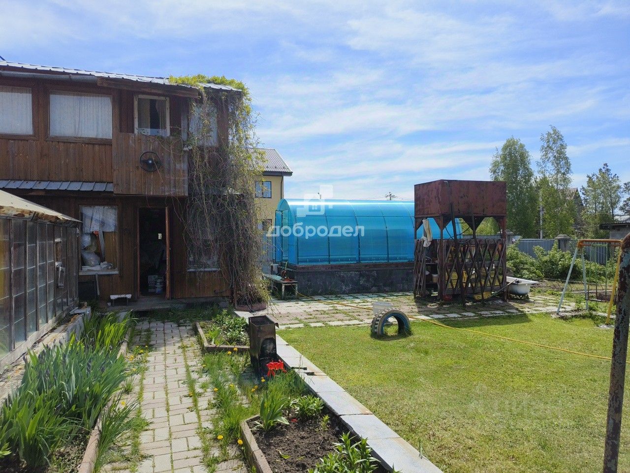 Участок огражден забором. Перед домом оборудована площадка для парковки и въезда, отделанная тротуарной плиткой.