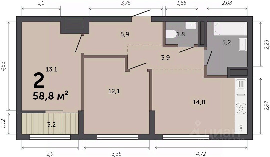 Общая площадь58,8 м2
