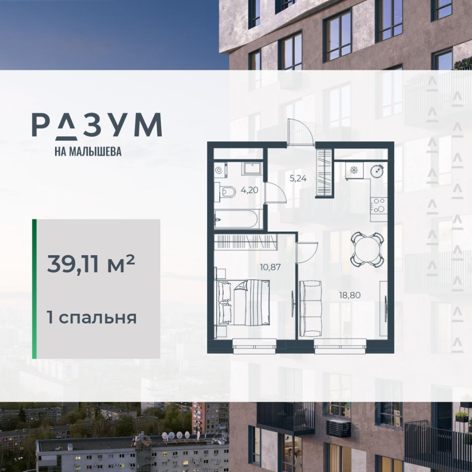 ''РАЗУМ на Малышева'' — это четыре 31-этажных башен на улице Малышева. Дополнительная приватность, безопасность и тишина создаётся за счёт возвышения домов на стилобате. Балконы на фасадах открывают виды на город и во двор, а угловые террасы открывают ещё больше простора и потрясающих видов. Жители квартала ''РАЗУМ на Малышева'' наслаждаются зелёными зонами круглый год. 60% территории занимает озеленение с деревьями, кустарниками и многолетниками.