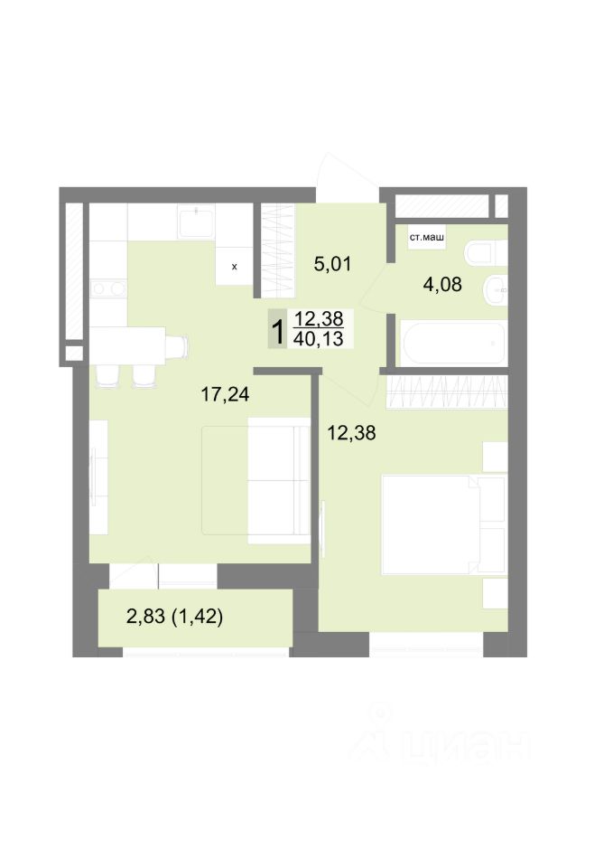 Общая площадь40,13 м2