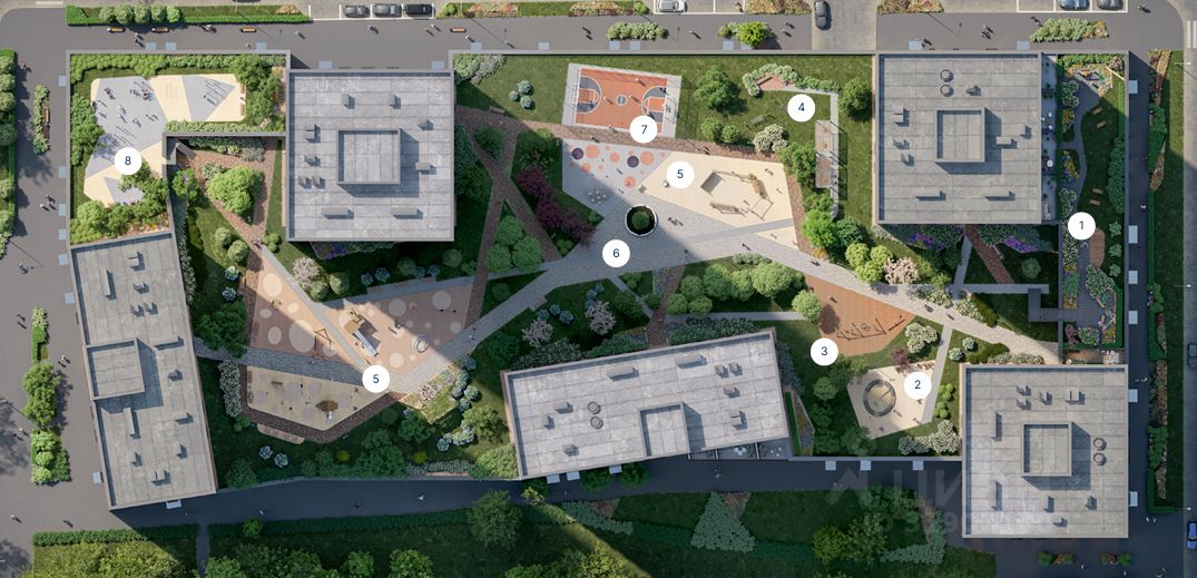 - двор с ландшафтным дизайном, детская, спортивная площадка\корты