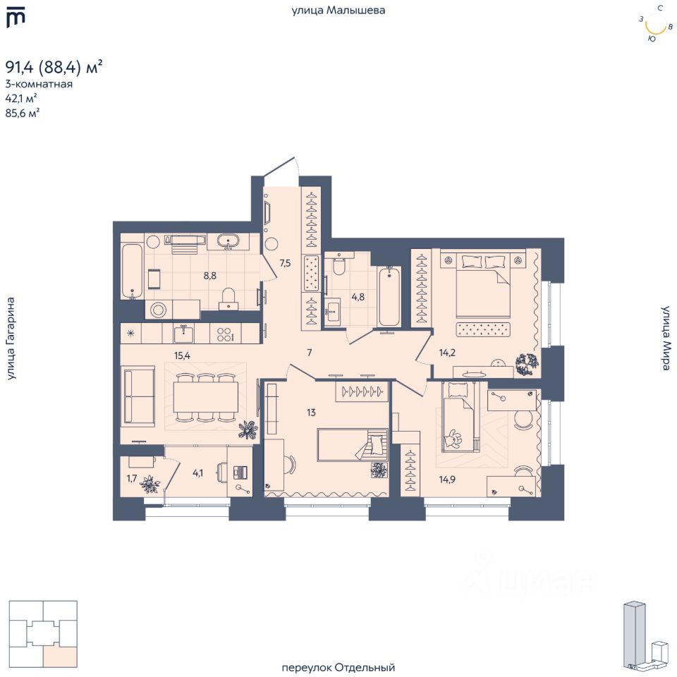 Рядом — улица Малышева и проспект Ленина, но в доме сохраняется тишина даже с открытыми окнами. Удобный выезд в любую часть города. В шаговой доступности — учебные заведения, магазины, скверы, медицинские и спортивные центры.