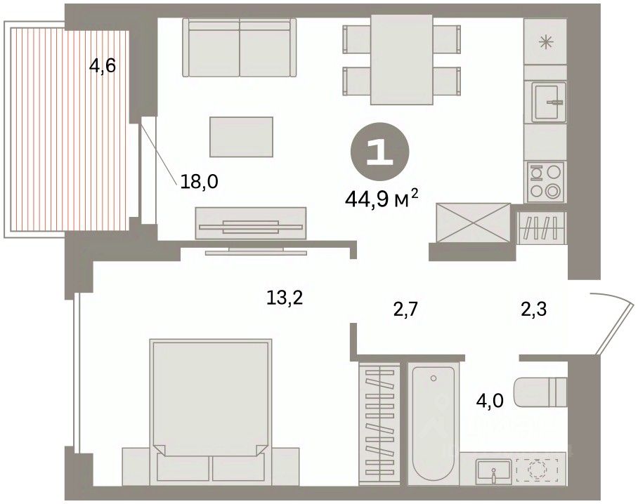 Квартира с кухней-гостиной и одной спальней в квартале ''Депо''. Особенности планировки: балкон, предчистовая отделка. квартиры в нашей базе: ДЕП07-Ж1.6.5.