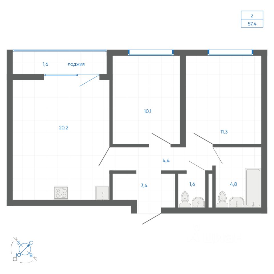 Общая площадь57,4 м2