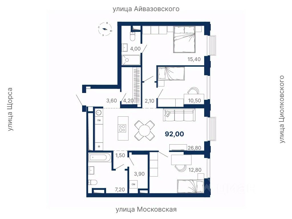 Локация — между ул. Московская, Щорса, Айвазовского и Циолковского, в шаговой доступности от метро Чкаловская.