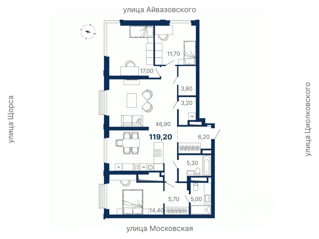 Локация — между ул. Московская, Щорса, Айвазовского и Циолковского, в шаговой доступности от метро Чкаловская.
