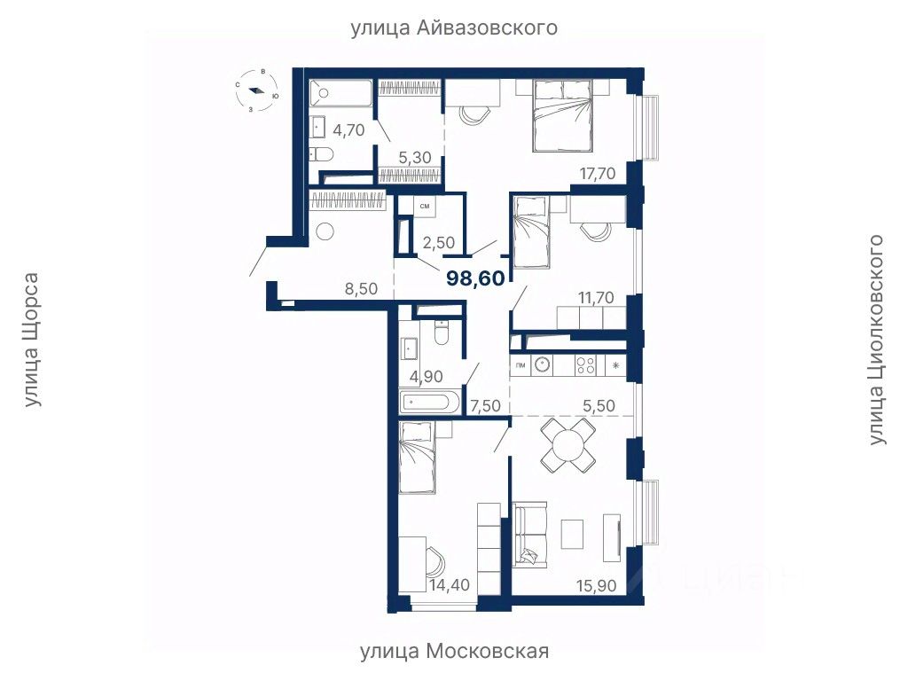 Локация — между ул. Московская, Щорса, Айвазовского и Циолковского, в шаговой доступности от метро Чкаловская.