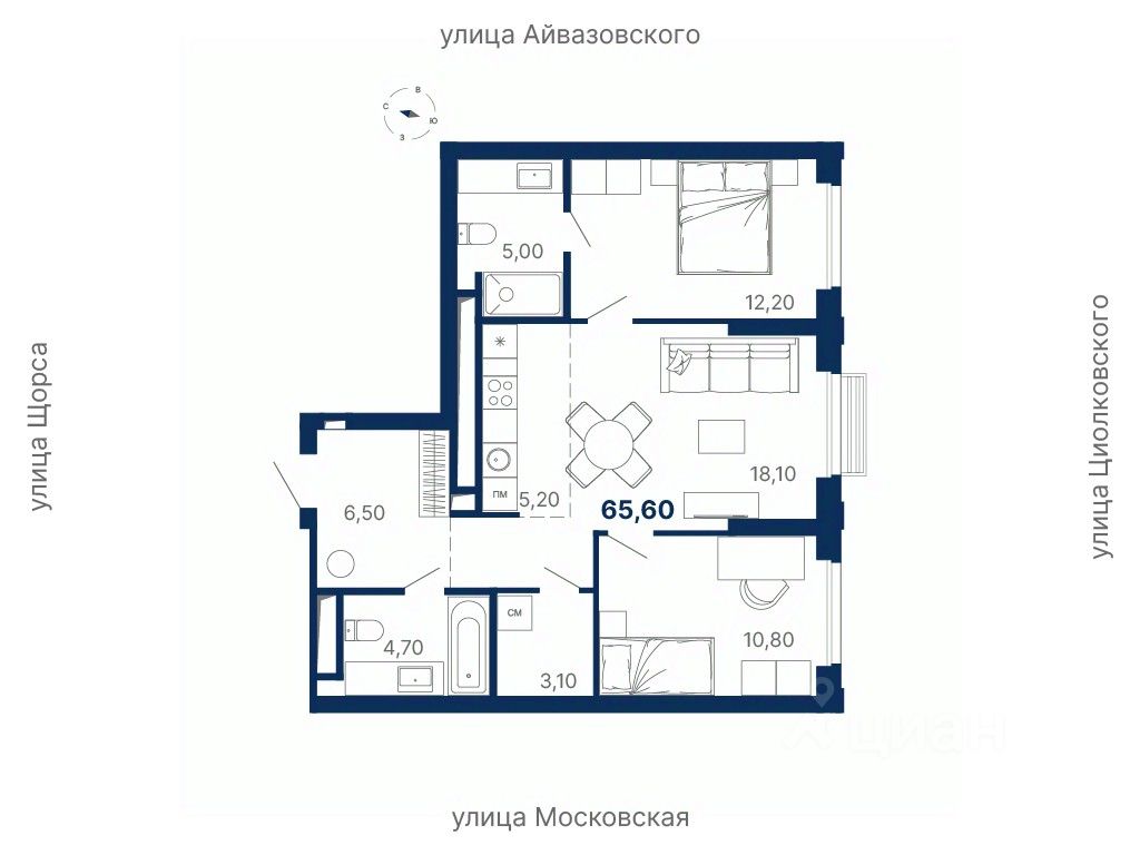 Удобное расположение между ул. Московская, Щорса, Айвазовского и Циолковского — рядом метро Чкаловская и всё необходимое для жизни.