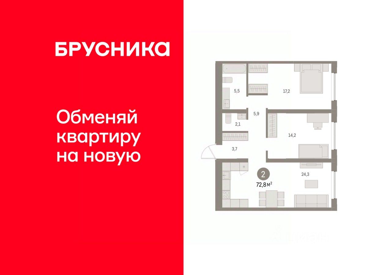 Квартира с кухней-гостиной и двумя спальнями в районе Шишимская горка. Особенности планировки: предчистовая отделка. квартиры в нашей базе: ШГР17.1-Ж2.4.1.