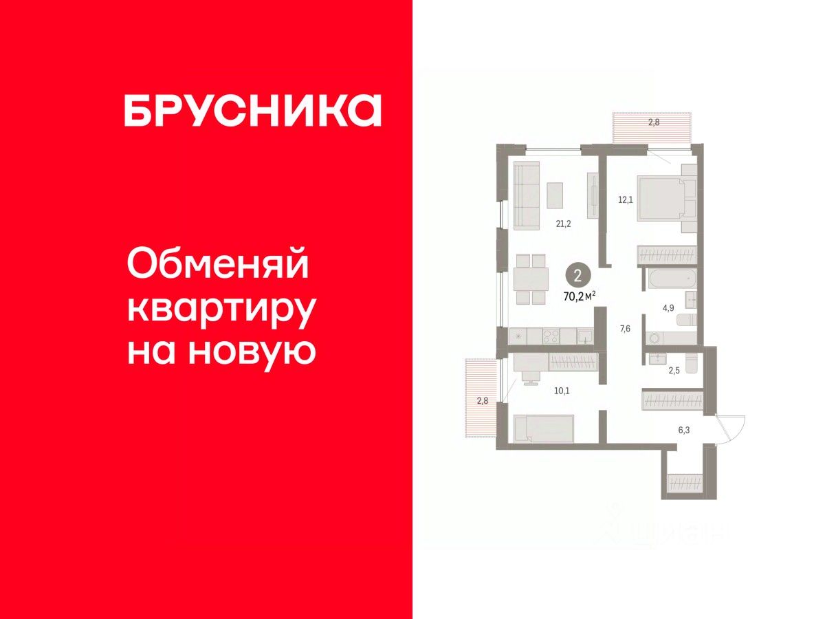 Квартира с кухней-гостиной и двумя спальнями в районе Шишимская горка. Особенности планировки: балкон, второй санузел, предчистовая отделка, разнесённые спальни. квартиры в нашей базе: ШГР17.1-Ж2.13.6.