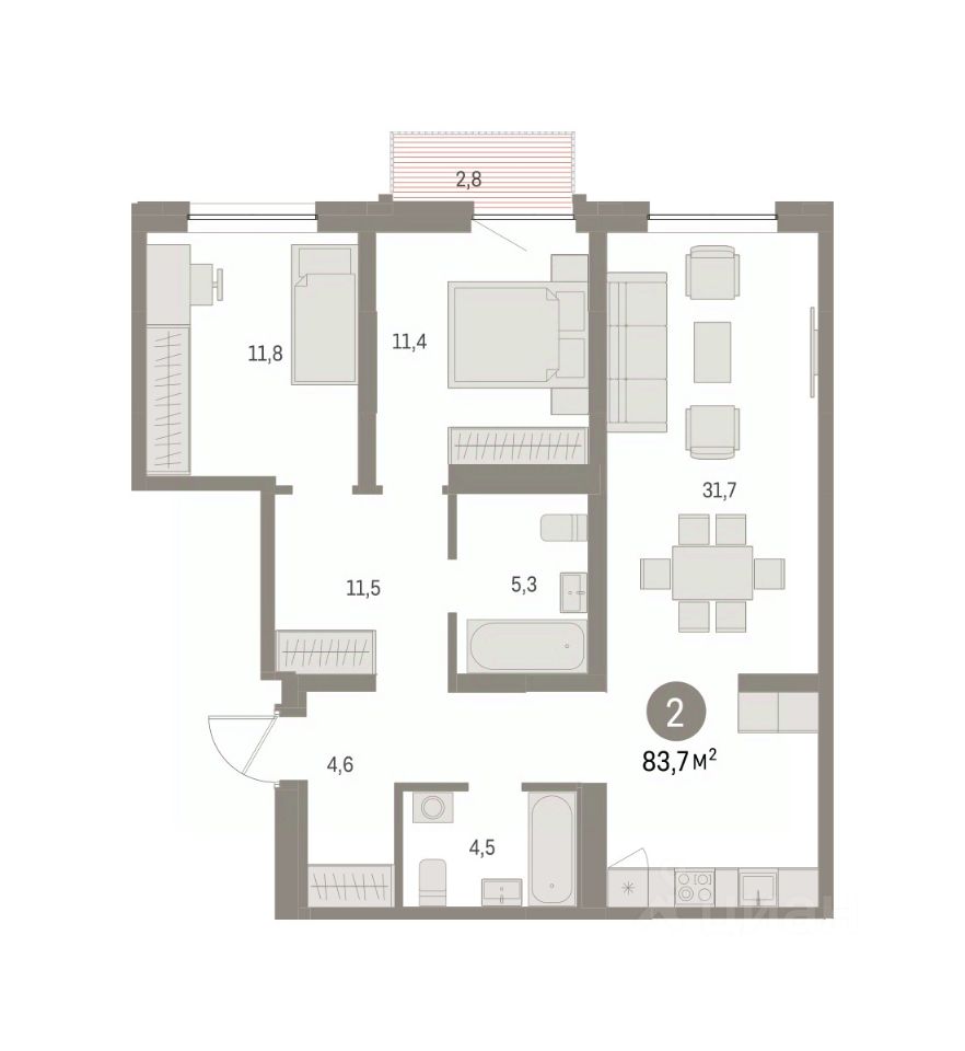 Квартира с кухней-гостиной и двумя спальнями в районе Шишимская горка. Особенности планировки: балкон, второй санузел, предчистовая отделка. квартиры в нашей базе: ШГР17.1-Ж2.10.7.