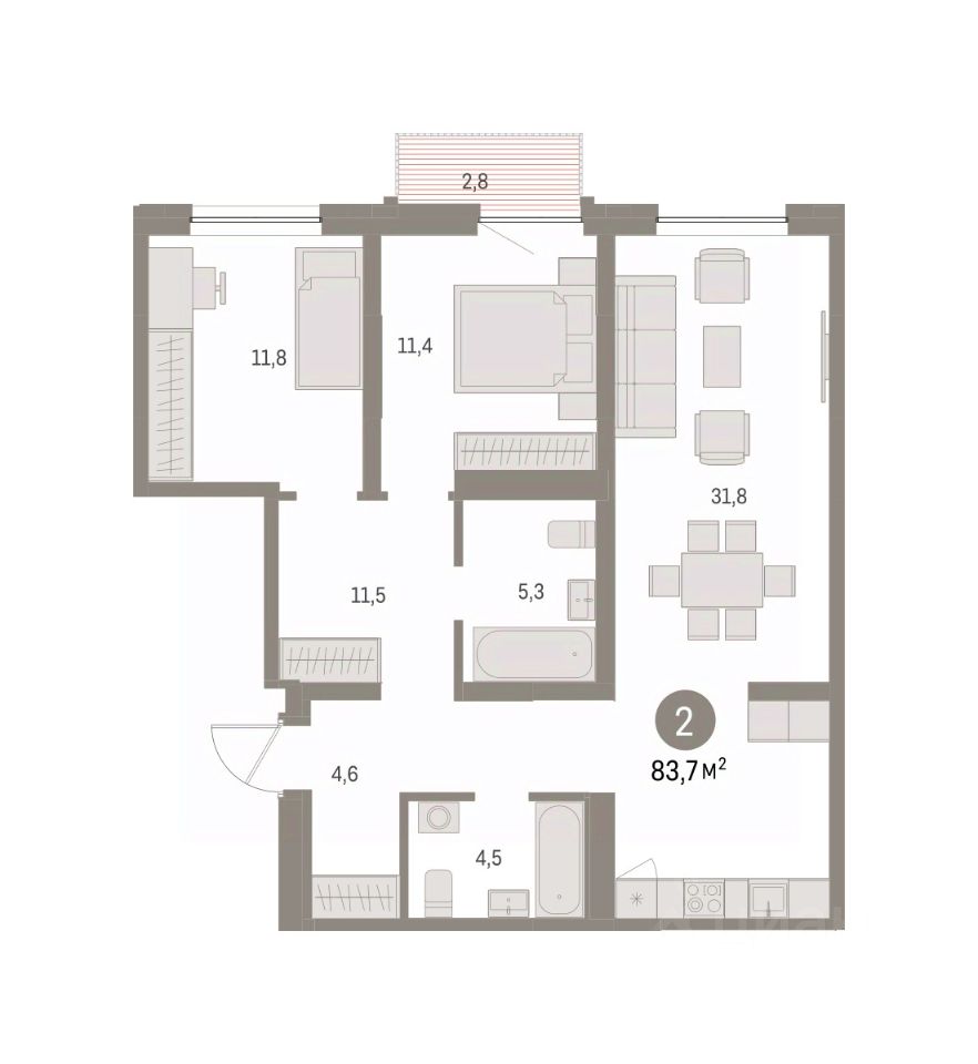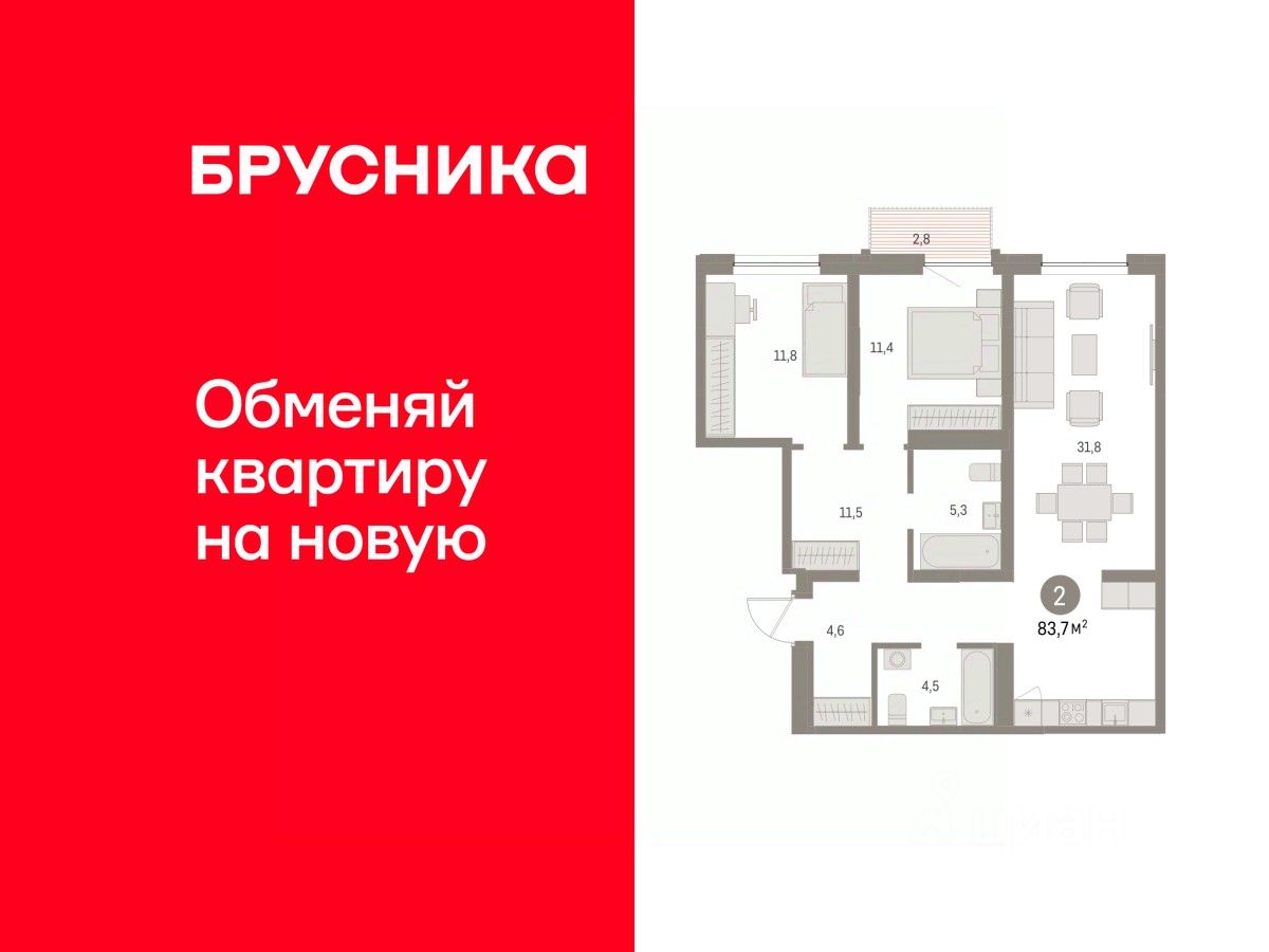 Квартира с кухней-гостиной и двумя спальнями в районе Шишимская горка. Особенности планировки: балкон, второй санузел, предчистовая отделка. квартиры в нашей базе: ШГР17.1-Ж2.7.7.