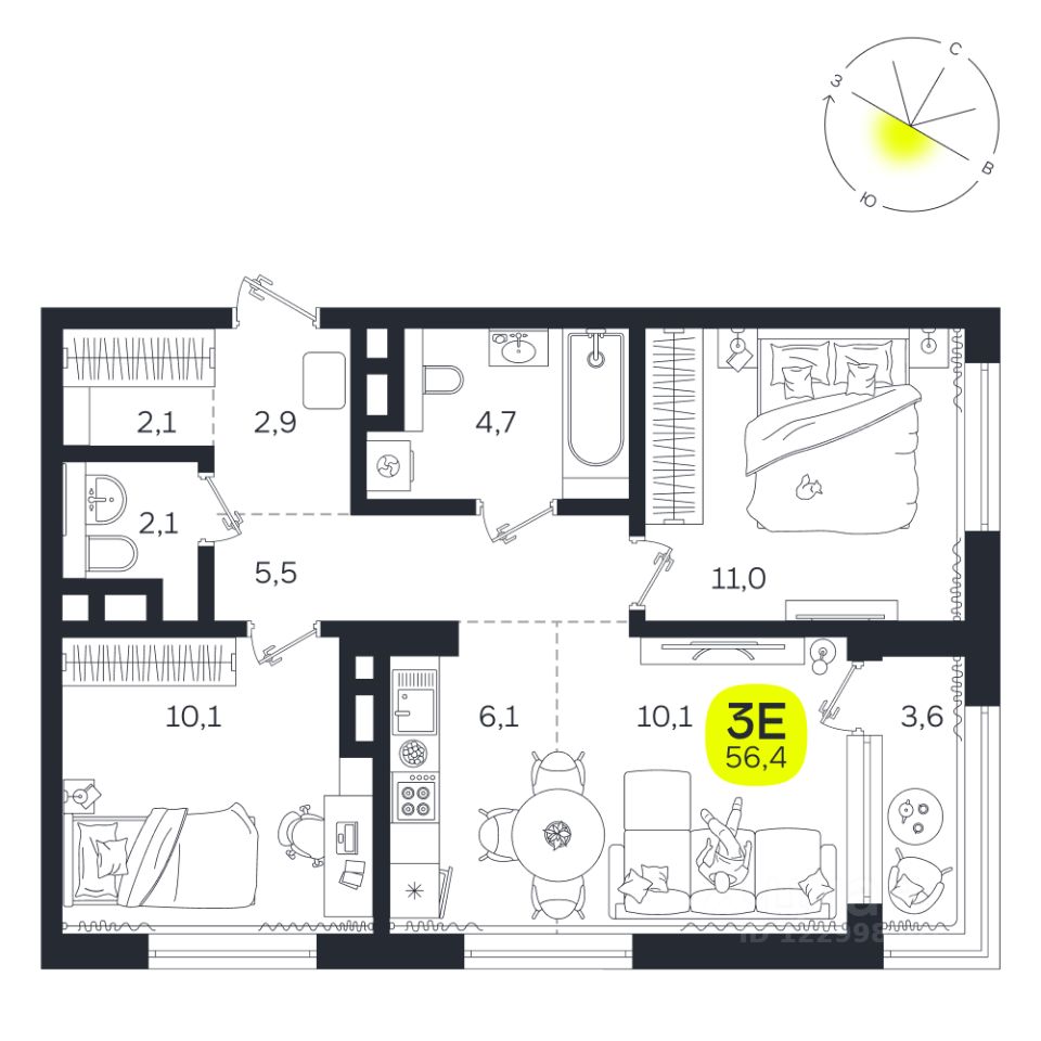 Общая площадь56,4 м2