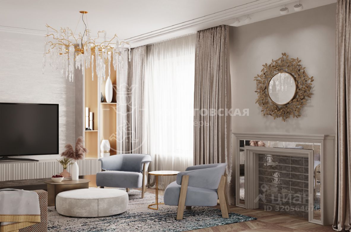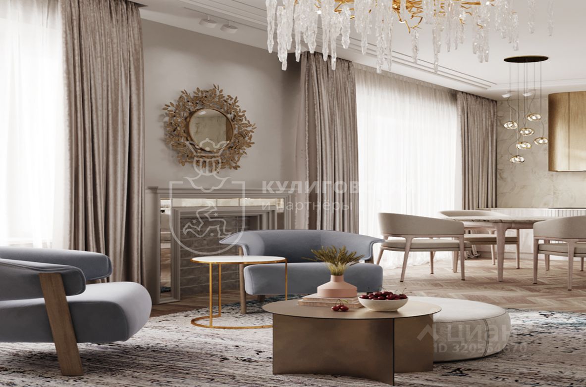 Пространство кухни-гостиной наполнено светом благодаря панорамным окнам. Хрустальная люстра и стильный декор подчеркивают изысканность интерьера, а уютные кресла и текстиль дополняют его, создавая гармоничную и комфортную атмосферу. Зона кухни сочетает стиль и функциональность: минималистичный дизайн, чистые линии и встроенная бытовая техника.