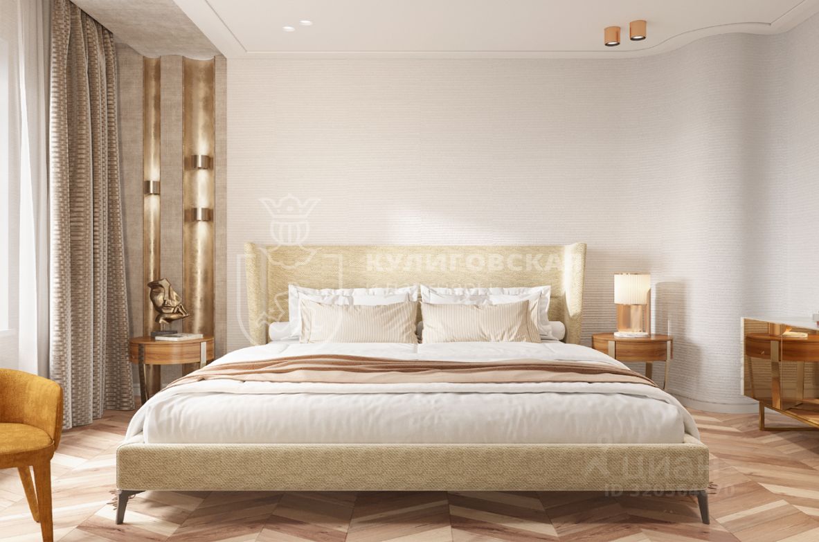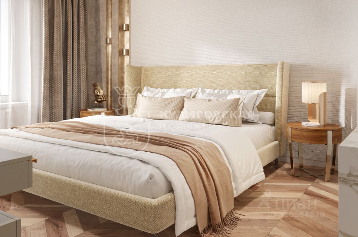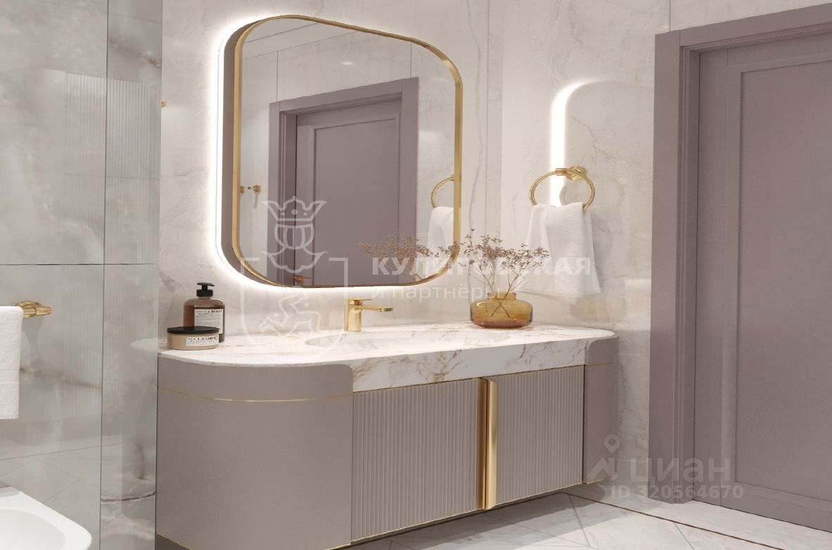 Мастер-спальня с собственной ванной комнатой — идеальное пространство для отдыха и расслабления. Мягкие теплые тона и элегантные акценты создают атмосферу покоя. Мраморные поверхности, золотые элементы и стильная фурнитура в ванной комнате — пример элегантности и утонченности.