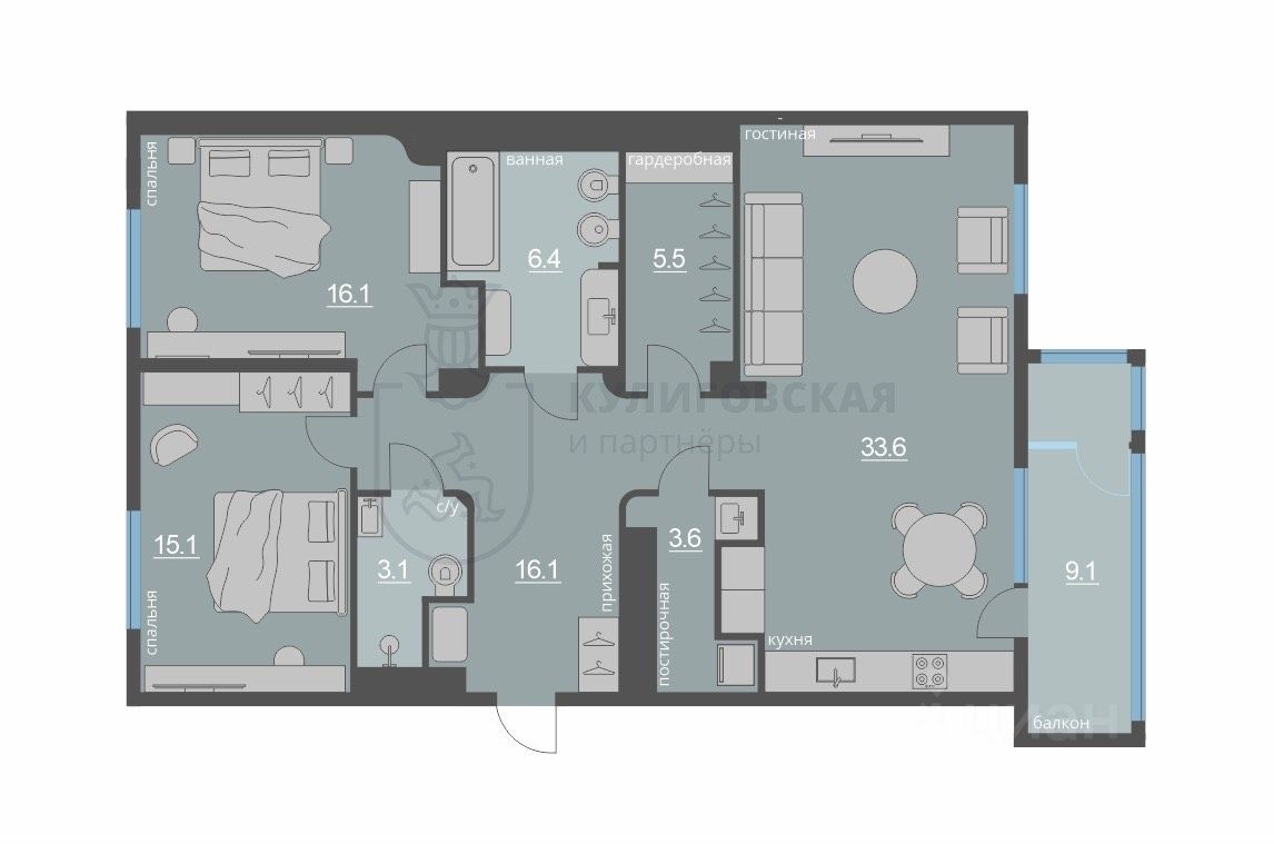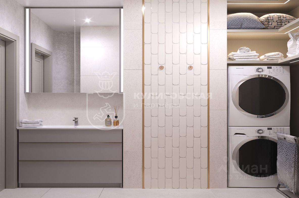 Также в квартире предусмотрены гостевой санузел, функциональный гардероб и постирочная комната.