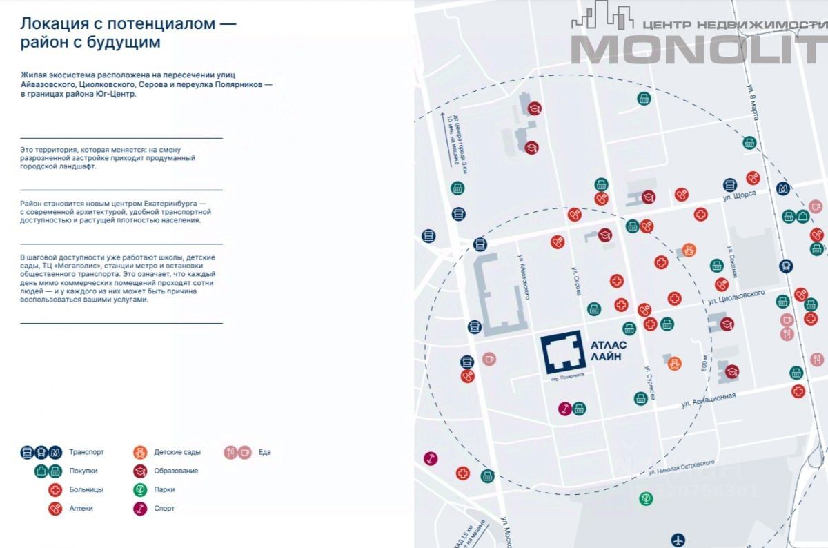 Инфраструктура: Помещение находиться в современном Жилом комплексе класса Комфорт Плюс Атлас Лайн, с количеством жителей 2300 человек. Рядом идет строительство новых жилых комплексов этажностью от 7-30 этажей, высокий потенциал для вашего бизнеса или сдачи в аренду.