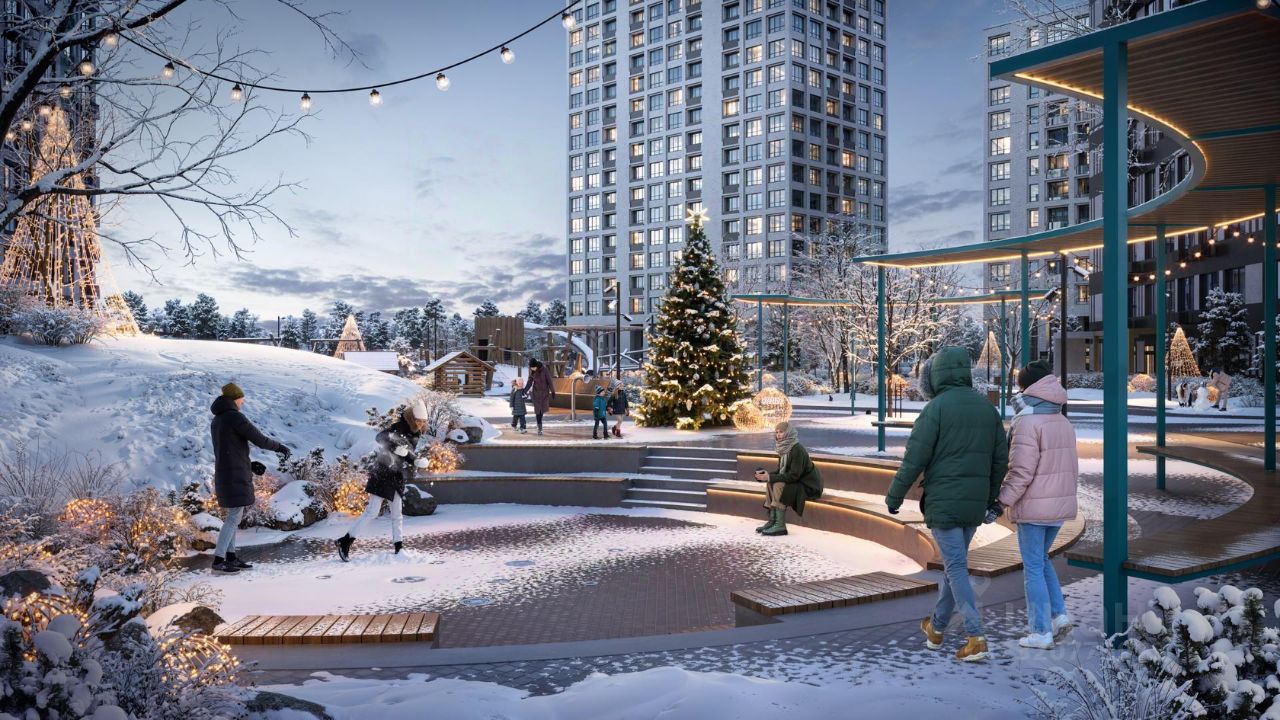 Благоустроенные дворы. Наполнение двора детально продумано, с учетом потребностей каждого жителя. Детские площадки для разных возрастов, зоны отдыха, зеленые аллеи и пешеходные дорожки. В центре двора предусмотрен амфитеатр для общих встреч жителей и больших мероприятий. Собственная сервисная компания 24/7 поддерживает чистоту территории жилого квартала.