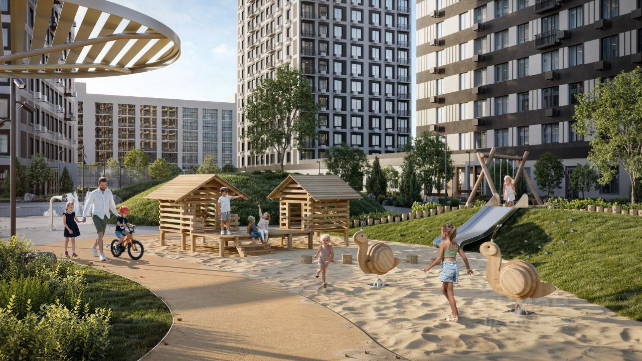 Благоустроенные дворы. Наполнение двора детально продумано, с учетом потребностей каждого жителя. Детские площадки для разных возрастов, зоны отдыха, зеленые аллеи и пешеходные дорожки. В центре двора предусмотрен амфитеатр для общих встреч жителей и больших мероприятий. Собственная сервисная компания 24/7 поддерживает чистоту территории жилого квартала.