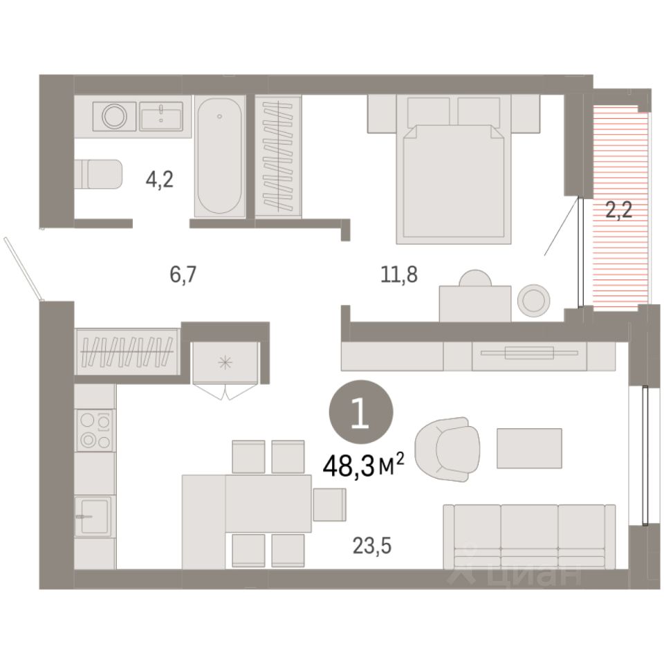 Квартира с кухней-гостиной и одной спальней в Южных кварталах. Особенности планировки: лоджия, предчистовая отделка. квартиры в нашей базе: ЮКВ11-Ж1.14.4.