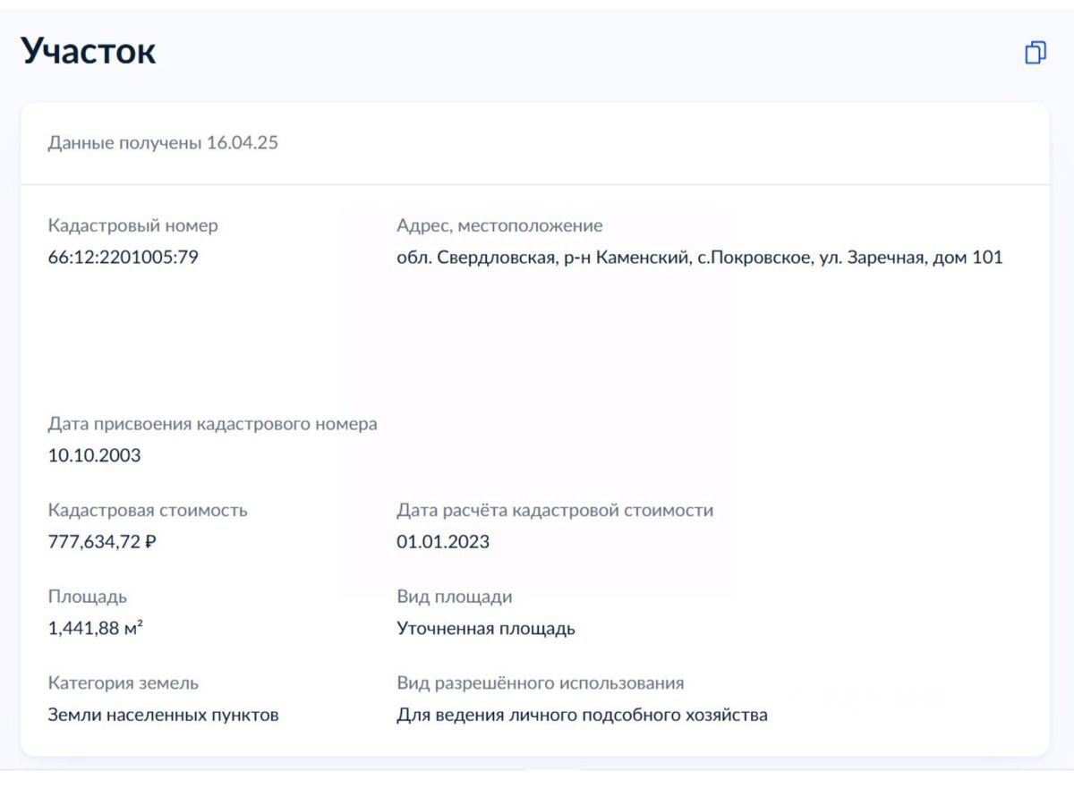 Кадастровый номер участка: 66:12:2201005:79