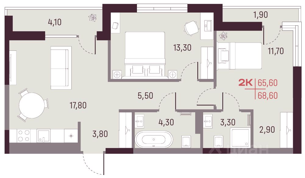 Общая площадь65,6 м2