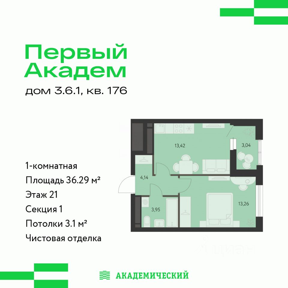 Продается 1-комнатная квартира площадью 36.29 кв.м. от девелопера ''Академический'' в жилом квартале ''Первый Академ''. Срок сдачи дома в 2026 году. Выгоды и скидка напрямую от застройщика.