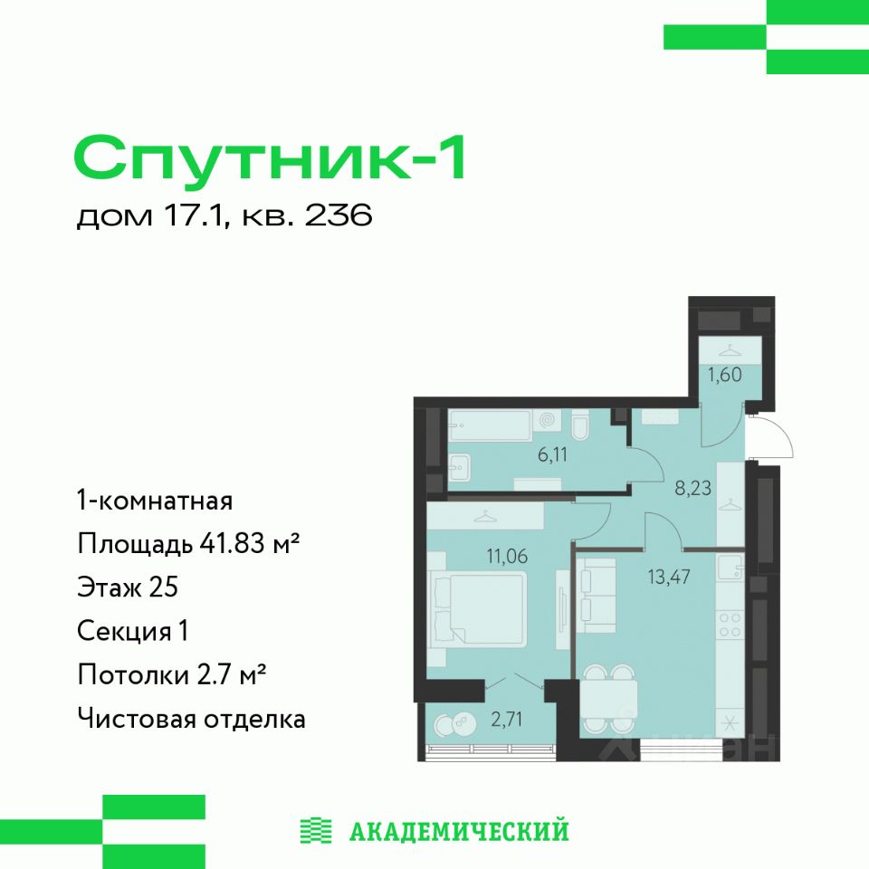 Продается 1-комнатная квартира площадью 41.83 кв.м. от девелопера ''Академический'' в жилом квартале ''Спутник 1''. Срок сдачи дома в 2027 году.