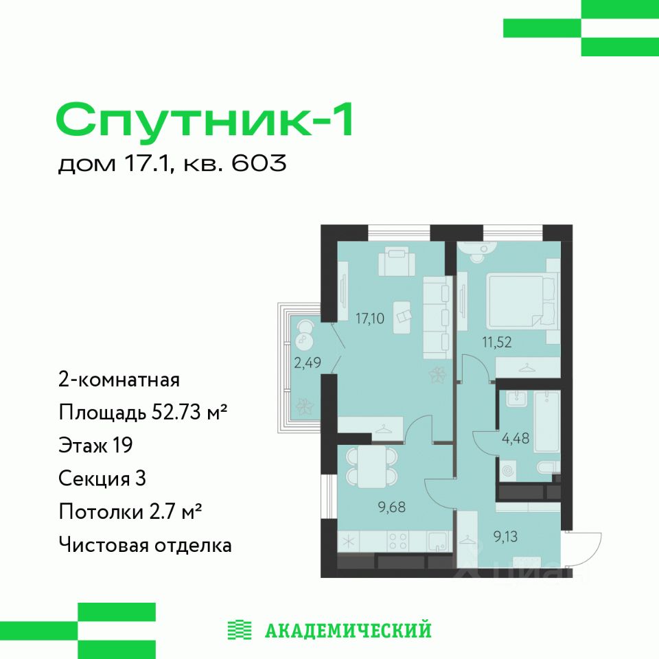 Продается 2-комнатная квартира площадью 52.73 кв.м. от девелопера ''Академический'' в жилом квартале ''Спутник 1''. Срок сдачи дома в 2027 году.