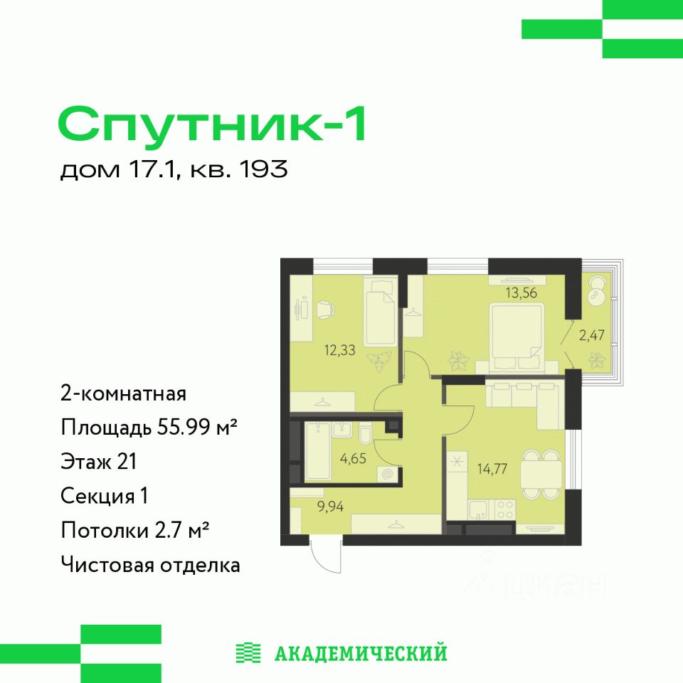 Продается 2-комнатная квартира площадью 55.99 кв.м. от девелопера ''Академический'' в жилом квартале ''Спутник 1''. Срок сдачи дома в 2027 году.