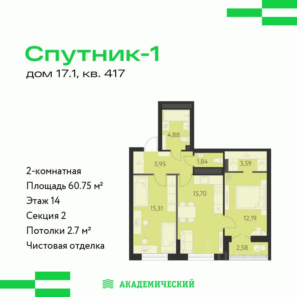 Продается 2-комнатная квартира площадью 60.75 кв.м. от девелопера ''Академический'' в жилом квартале ''Спутник 1''. Срок сдачи дома в 2027 году.