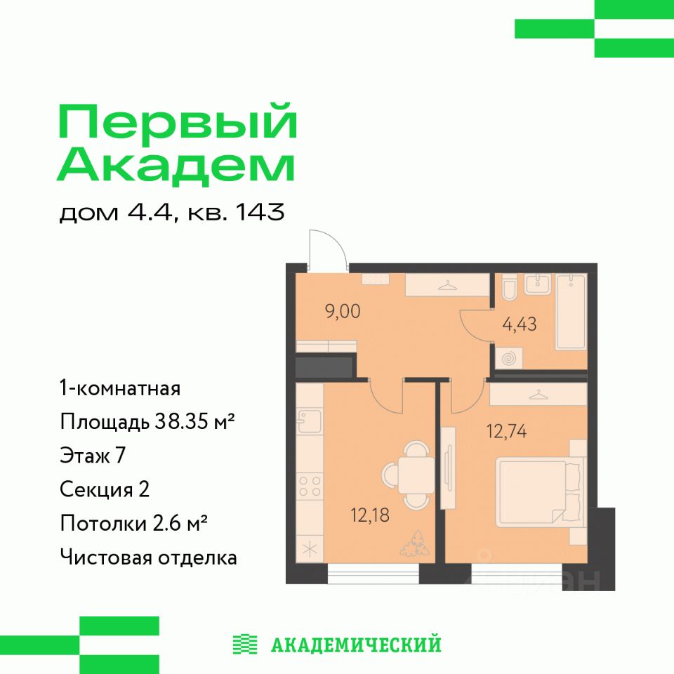 Продается 1-комнатная квартира площадью 38.35 кв.м. от девелопера ''Академический'' в жилом квартале ''Первый Академ''. Срок сдачи дома в 2028 году. Выгоды и скидка напрямую от застройщика.